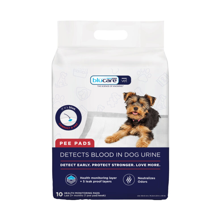 Blücare® Pee Pads help detect traces of blood in your dog’s urine at an early stage. Unlike pH-based monitoring pads, Blücare® reacts specifically to the presence of blood for more targeted insight.